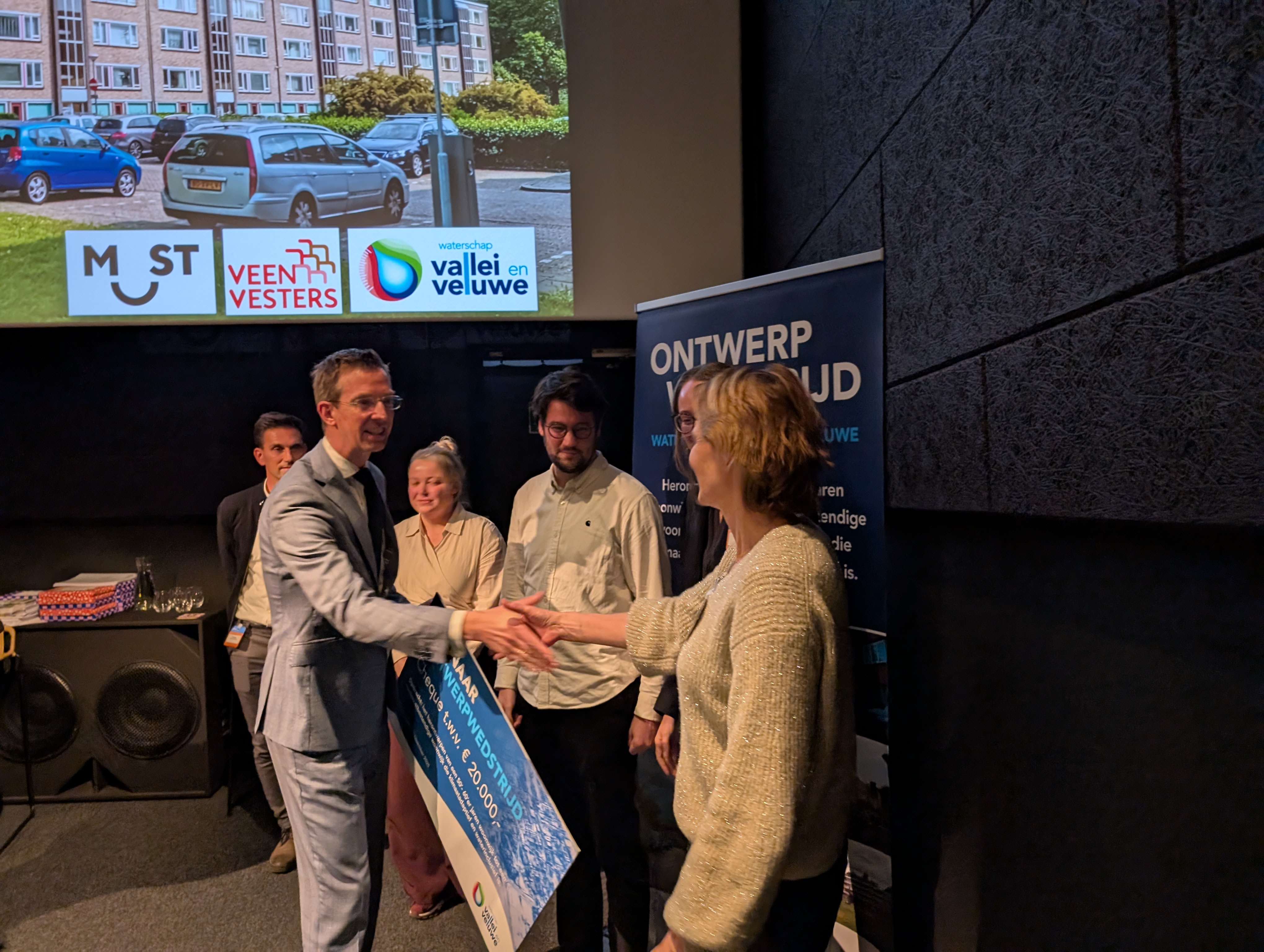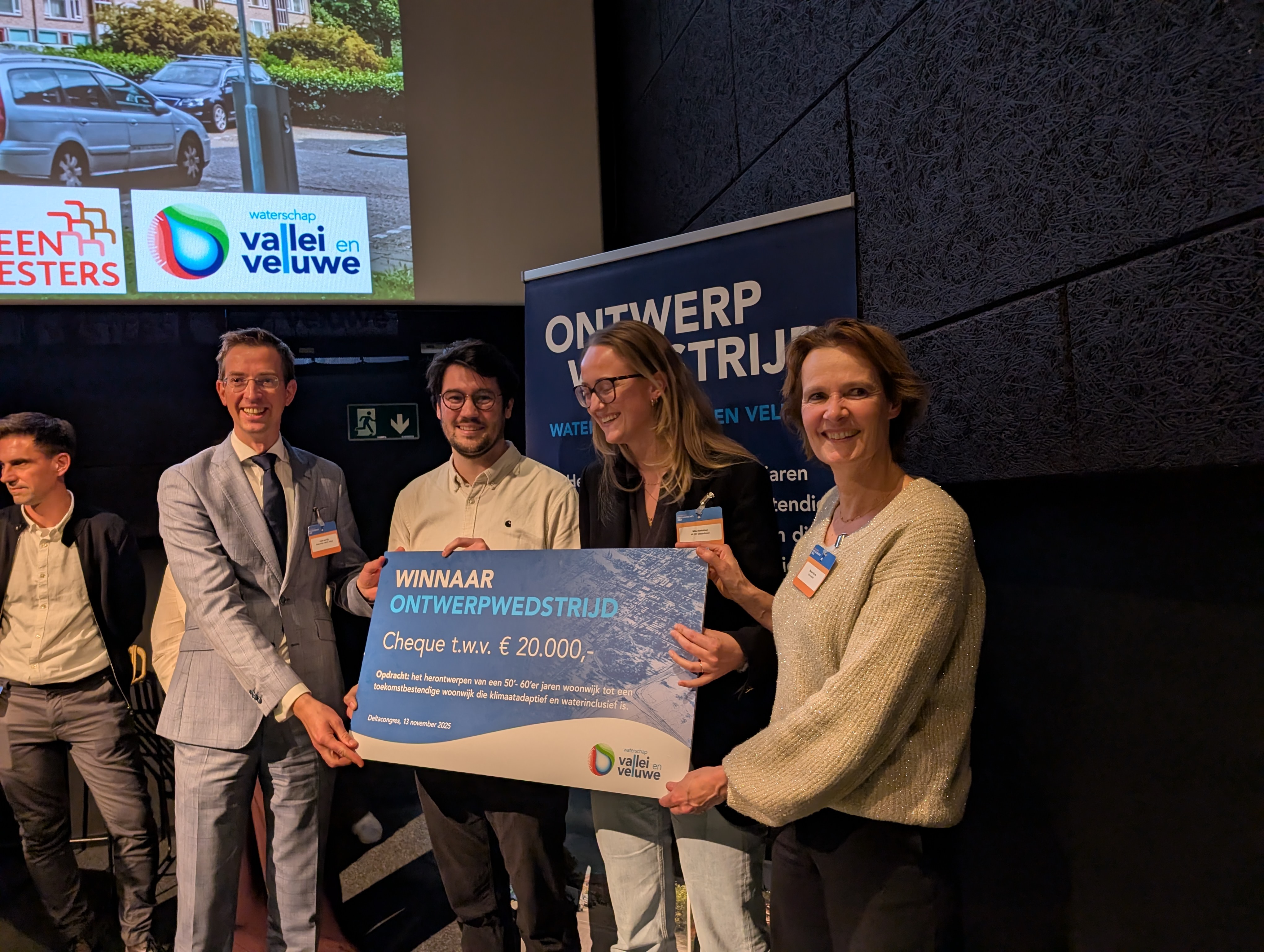 Tijdens het Deltacongres maakte Waterschap Vallei en Veluwe de winnaar bekend van de prijsvraag “Vernieuwen mét water van naoorlogse wijken”: Schrijverswijk in Veenendaal met het plan “Nieuw leven tussen Veen en Steen” (ontwerpteam Must, met Veenvesters en gemeente Veenendaal). De jury prees het winnende plan omdat het de volle breedte van het water- en bodemsysteem grondig analyseert, vertaalt naar slimme ingrepen in de openbare ruimte en die koppelt aan sociale én ecologische meerwaarde. Met de geldprijs van €20.000,-- kan direct één onderdeel worden gerealiseerd - “geen prijs voor de schouwkast, maar brandstof voor de eerste stap.”